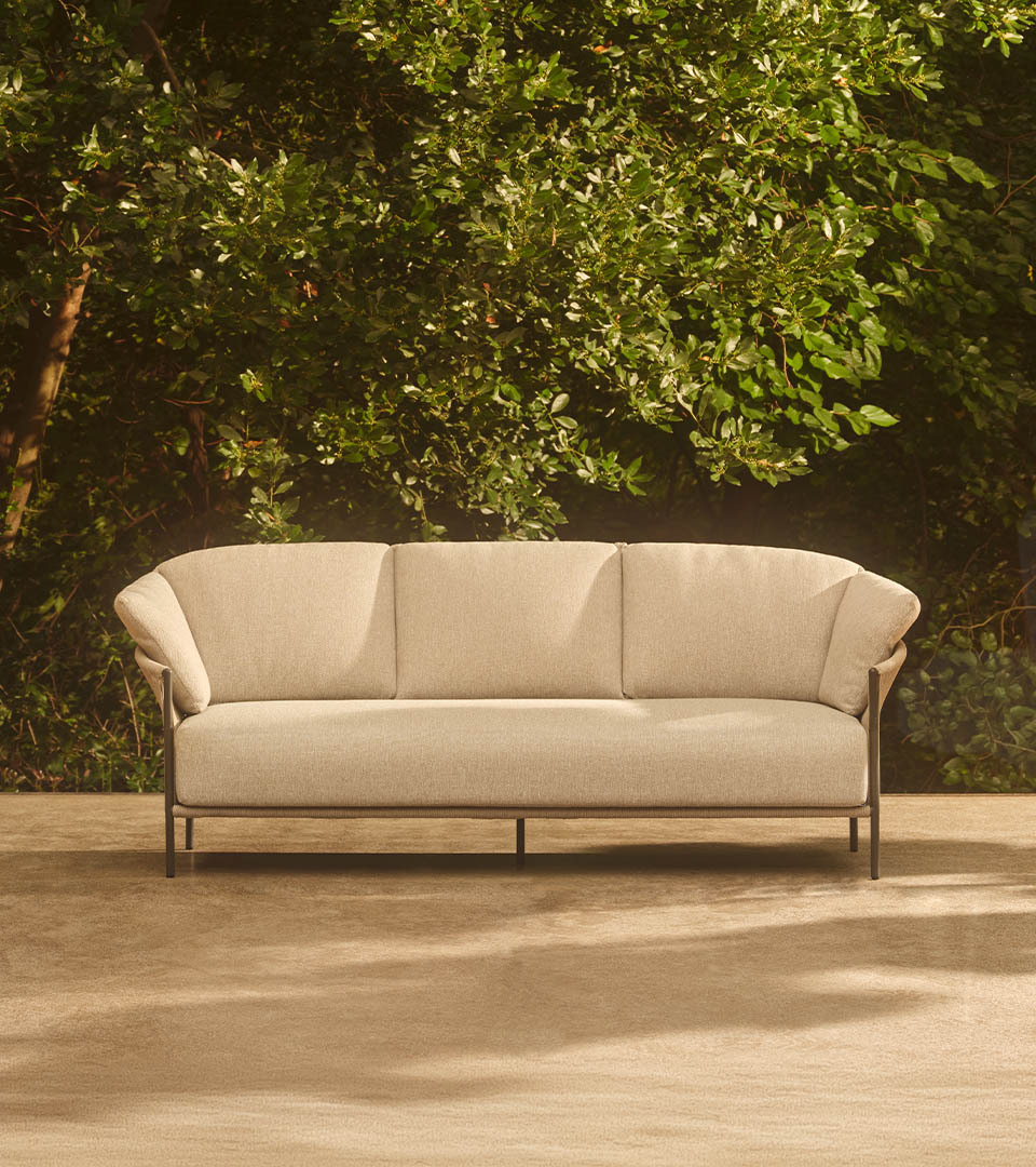 The collection is available in anthracite and dark taupe, sophisticated tones that highlight the woven texture and blend naturally with outdoor environments.