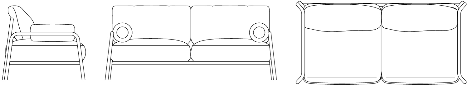 Main structure in curved and welded circular-section metal tubing; structural crosspieces in tubular metal with elliptical section and support platform of padded metal slats. Seat, backrest and armrests in covered foam.