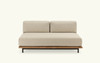 A two-seater padded sofa with wooden structure and woven backrest with waterproof padding.